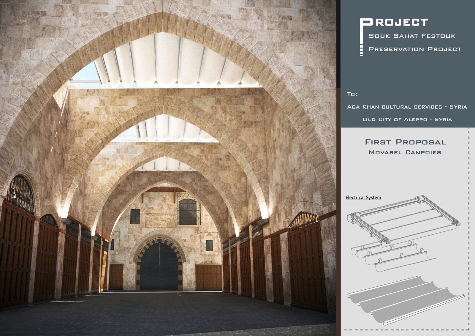 Die Wiederherstellung des Souq Festouk ist ein historisches Erbe-Projekt im Herzen der Altstadt von Aleppo. Ziel war die behutsame Revitalisierung des architektonischen Geistes nach der Zerstörung. Das Design fokussiert auf die Bewahrung der traditionellen Steingewölbe und die Wiederherstellung des authentischen Ambientes, um den Markt als kulturellen und kommerziellen Mittelpunkt der Stadt neu zu beleben.